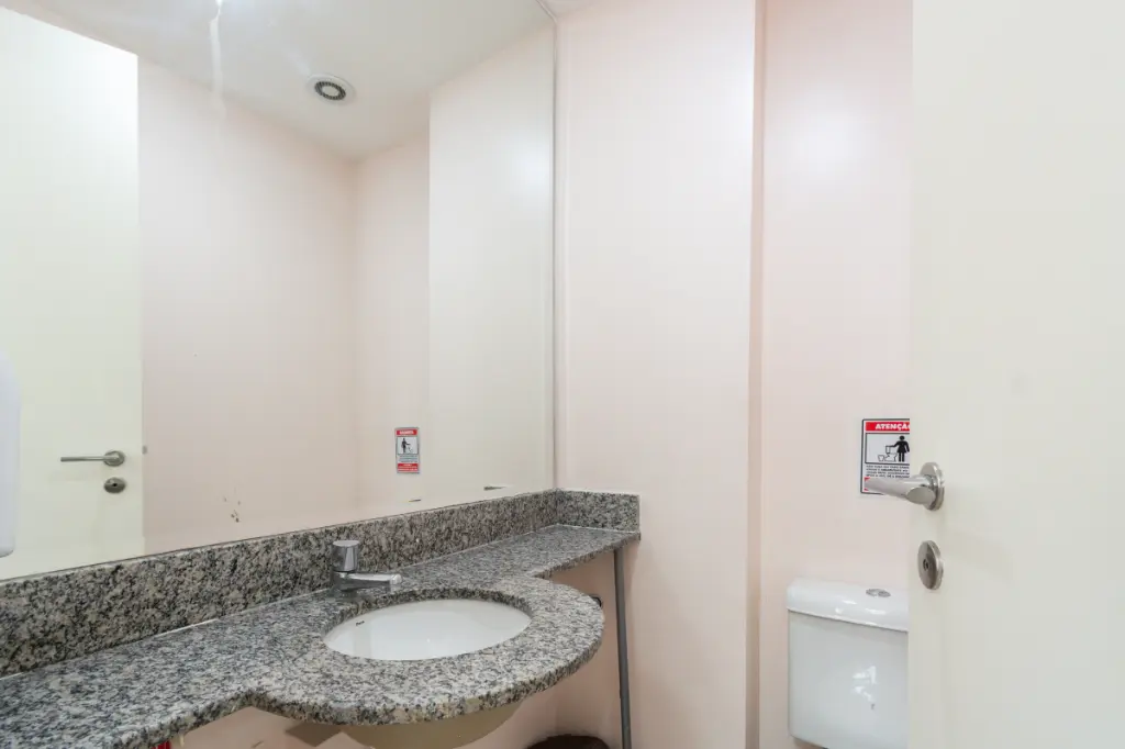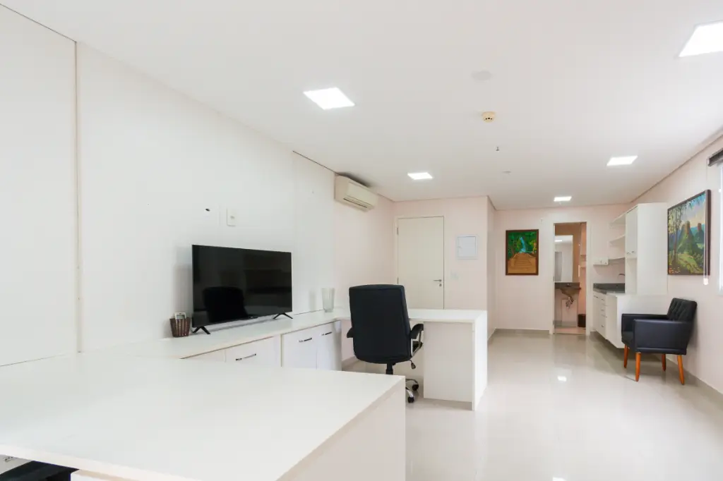 Situada em andar bem elevado, a sala oferece ótima iluminação natural, ventilação e um ambiente agradável para trabalho. O espaço é muito bem distribuído, com piso em porcelanato de alta qualidade, paredes em tons neutros e acabamento que transmite sofisticação e profissionalismo.