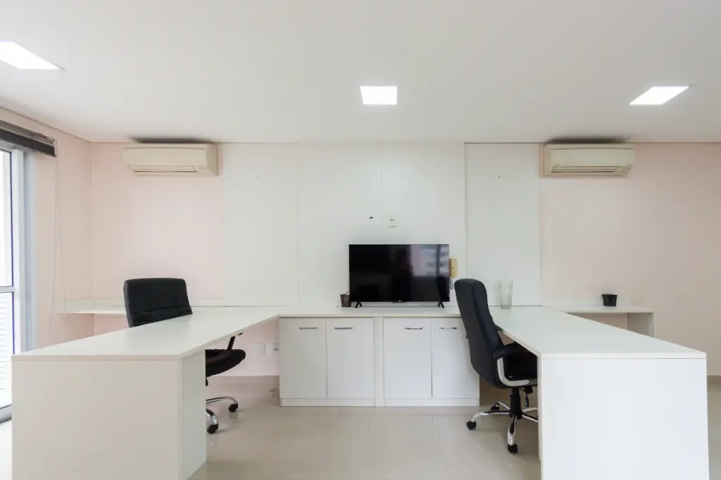 A sala encontra-se em excelente estado, já semi-planejada, contando com mobiliário funcional, como mesa de escritório, cadeira ergonômica e armário embutido, proporcionando praticidade e conforto para o dia a dia. Ideal para escritório, consultório ou atendimento personalizado.