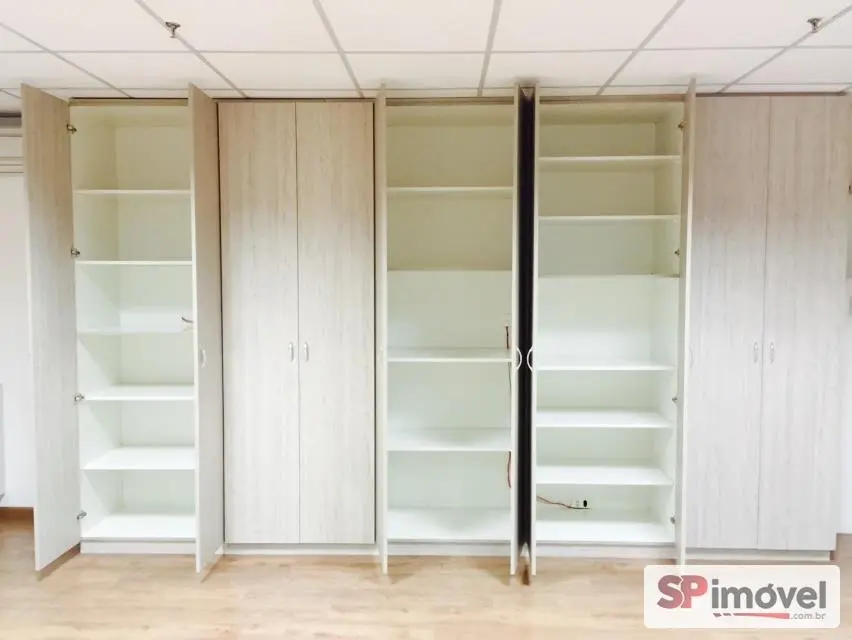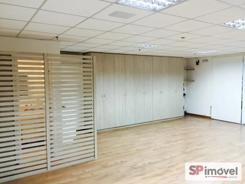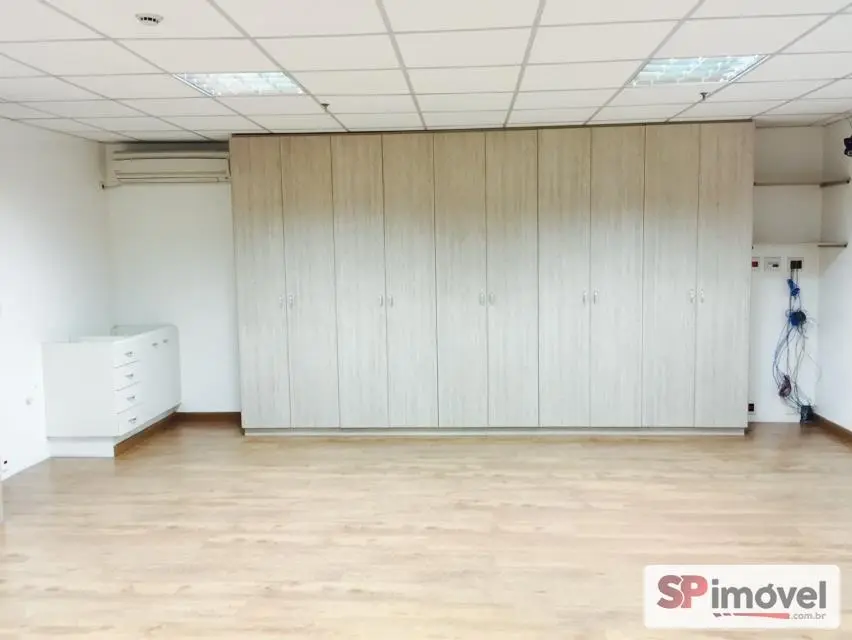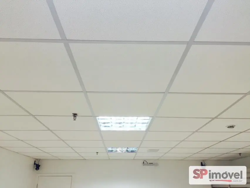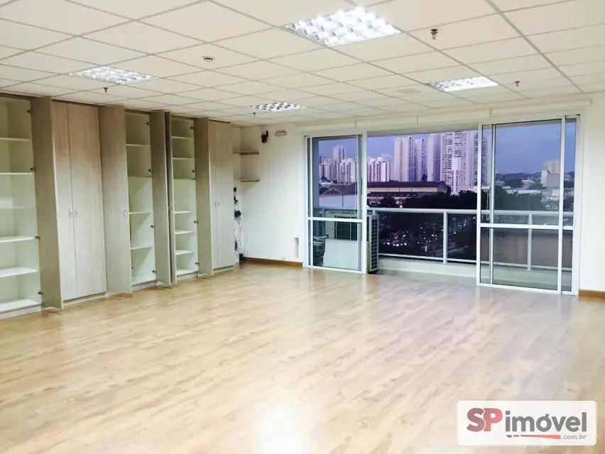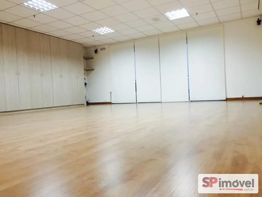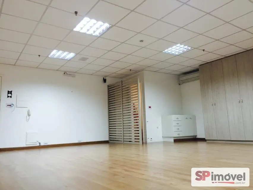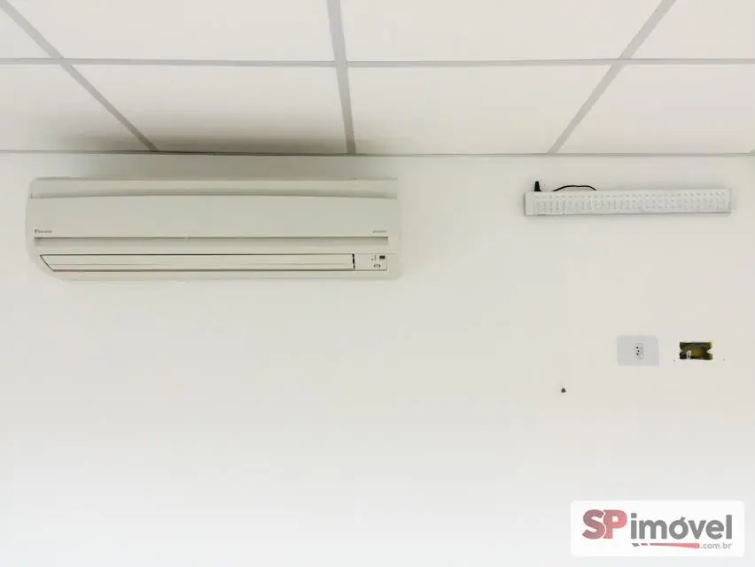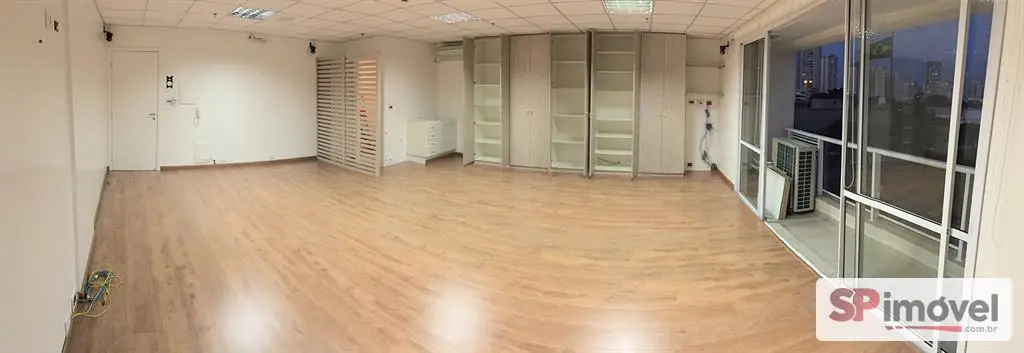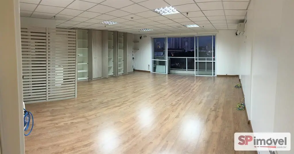 Sala de 61m² de área privativa e área total de 128m², com 2 vagas de garagem, banheiros social, copa e uma sacada com vista livre e sol da manhã, repleto de armário de escritório, 2 ares condicionados de 12mil BTUs Daikin, forro de teto modular de fibra anti-chamas, piso laminado, sistema elétrico bem distribuído, muitas tomadas espalhadas pela sala, diversas luminárias e cortina rolo.