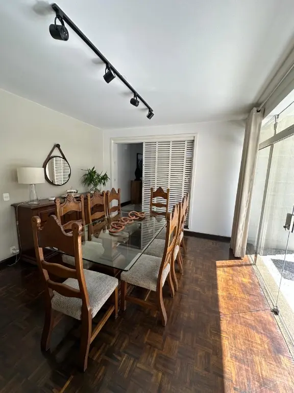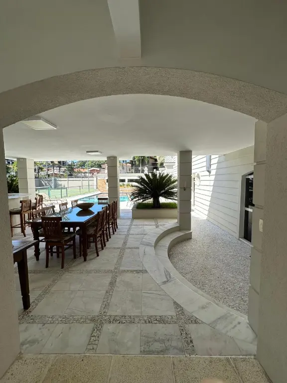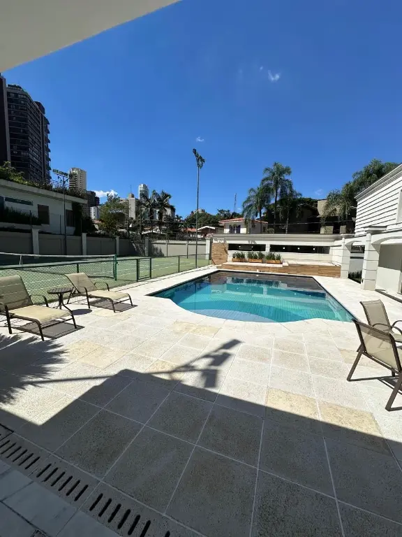 Conta com piscina, sauna a vapor, quadra de tênis, academia equipada, 2 suítes para funcionários, despensa, área gourmet com forno de pizza e churrasqueira, 2 vestiários, 2 depósitos e 10 banheiros, sendo 2 lavabos. Possui também sala com lareira, sala de TV, sala de jantar e copa.