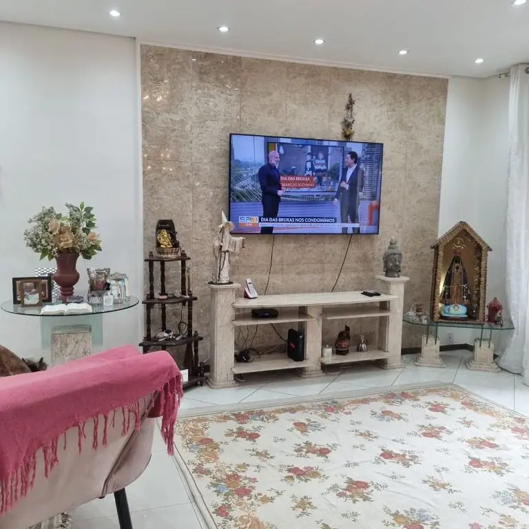 -Sala de estar com painel para tv de mármore.