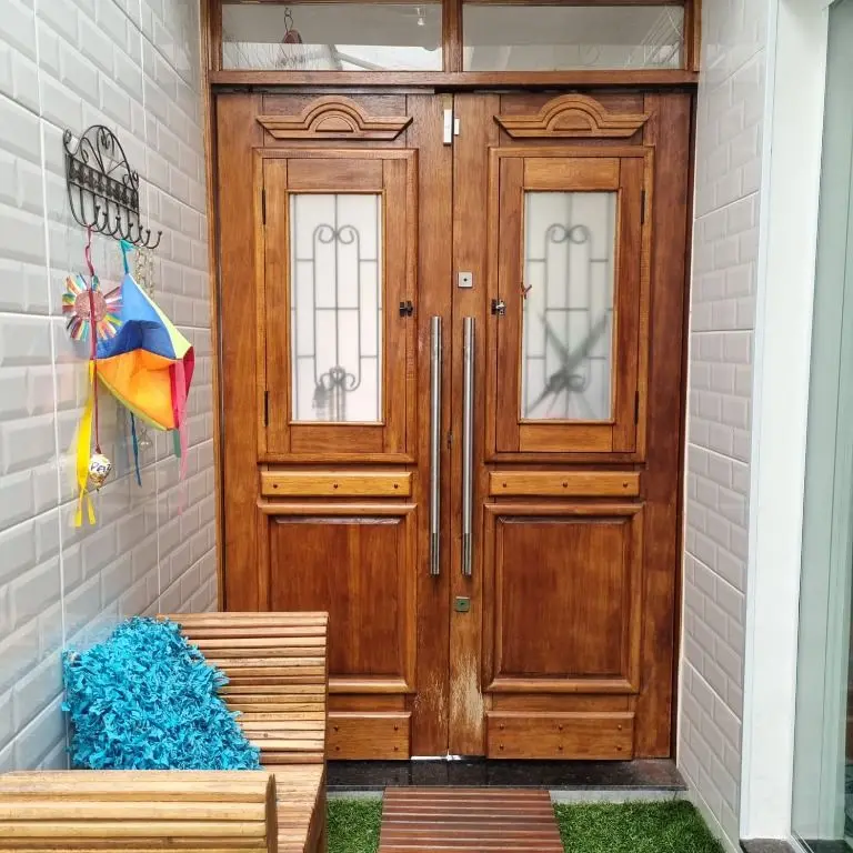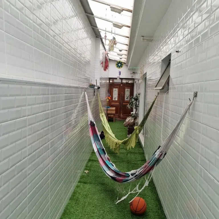 -Corredor lateral com grama sintética e redes para descanso e também outra opção de lazer.