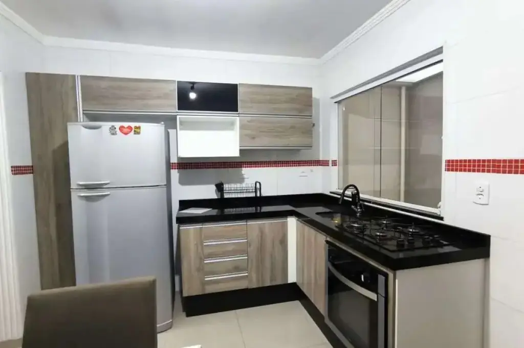 No primeiro pavimento, dispõe de uma sala ampla e confortável, integrada a uma cozinha espaçosa equipada com armários planejados, fogão cooktop e forno. A área de serviço é separada e possui cobertura retrátil, garantindo praticidade e ventilação.