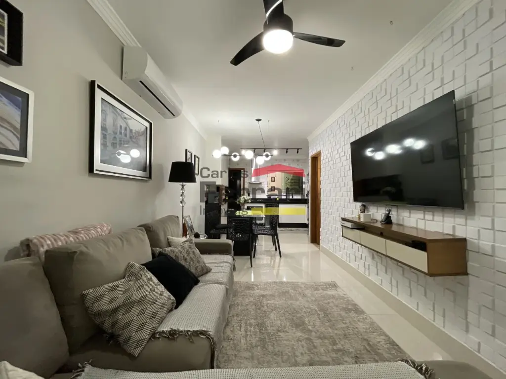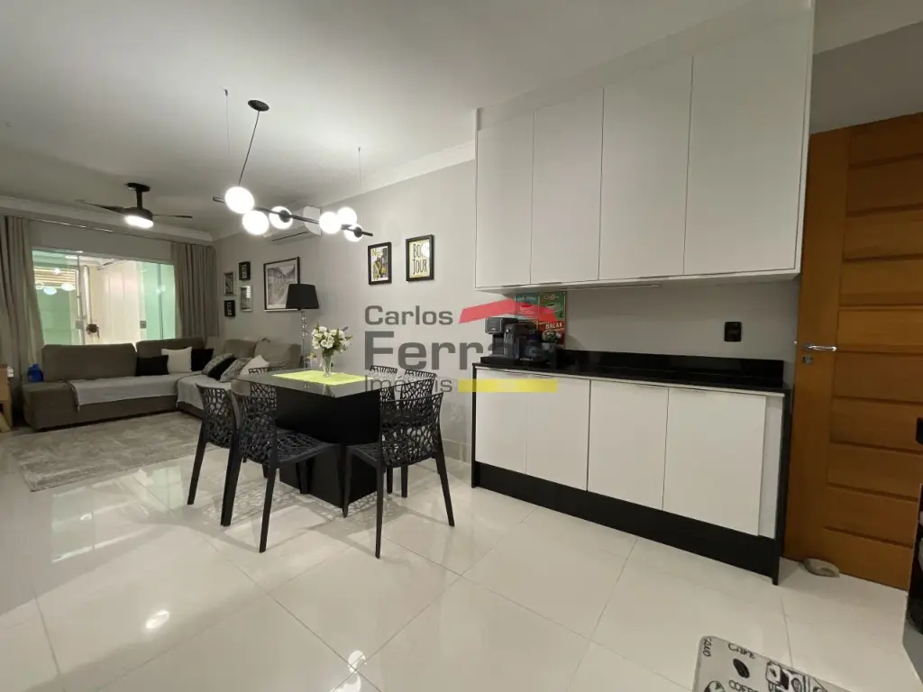 A área social possui sala de visita, sala de jantar e cozinha integradas, criando um ambiente moderno, amplo e bem iluminado.