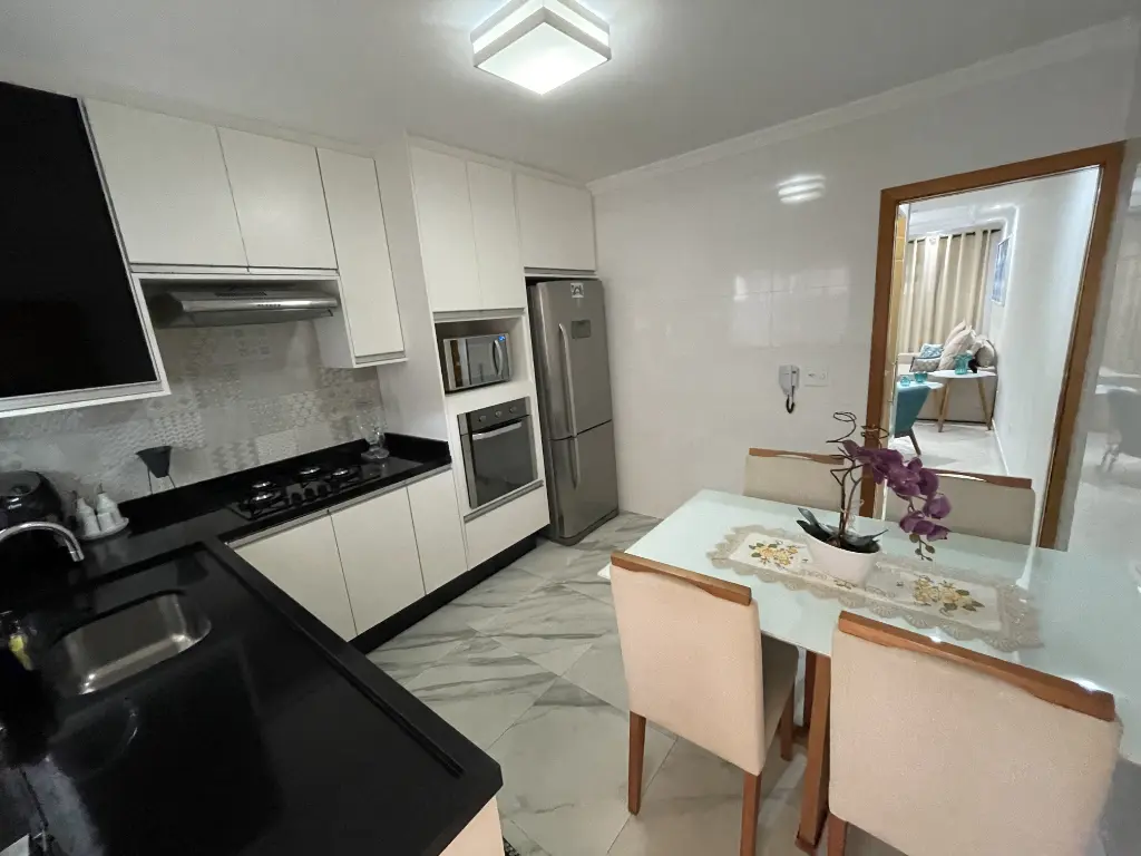 Cozinha funcional e moderna, também com porcelanato e armários planejados de ótima qualidade, proporcionando praticidade e organização.
