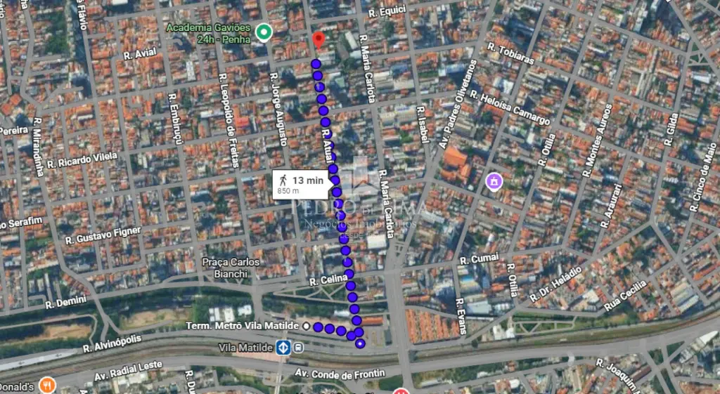 Já a distância entre o imóvel e a estação Vila Matilde do metrô (linha vermelha), são de 850m (10 minutos de caminhada).
