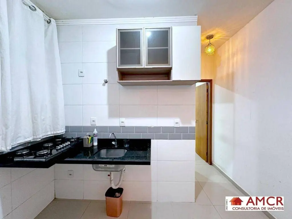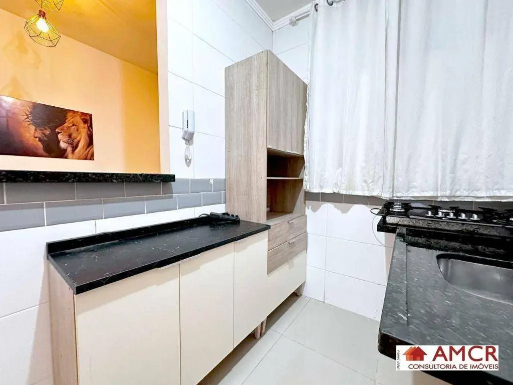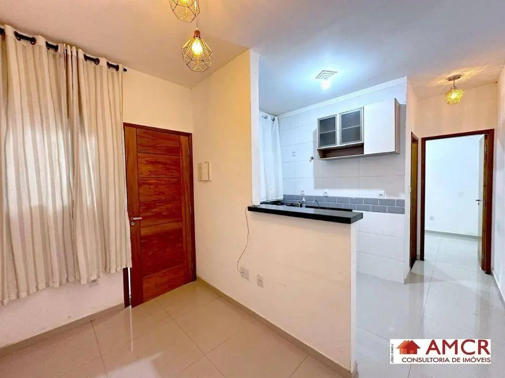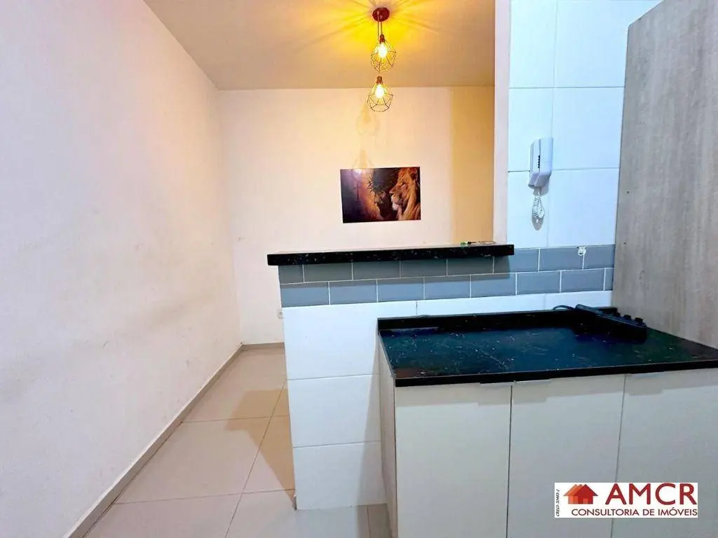 Apartamento de 30 m², com 2 dormitório, sala, cozinha com armário, gabinete, balcão e fogão, área de serviço.