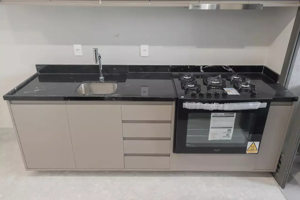 Cozinha americana com armários, fogão e forno