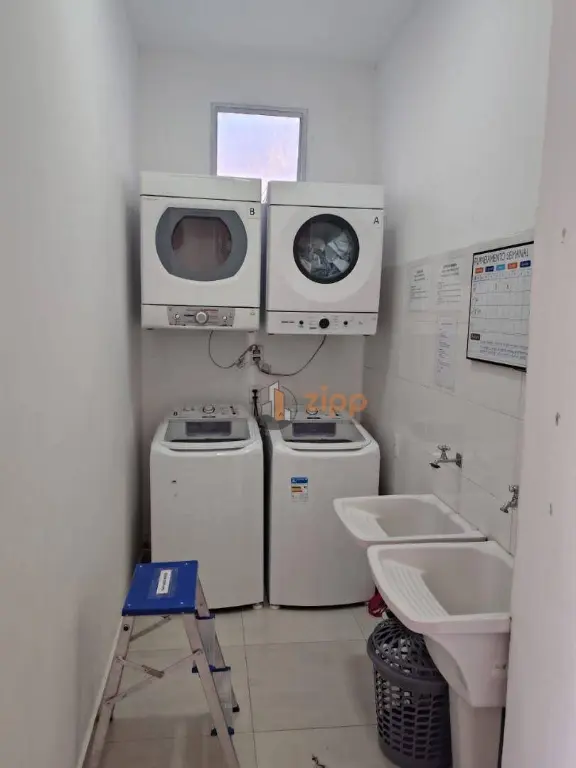 A lavanderia coletiva com 2 tanques, 2 máquinas lavadoras e 2 máquinas secadoras de roupas.