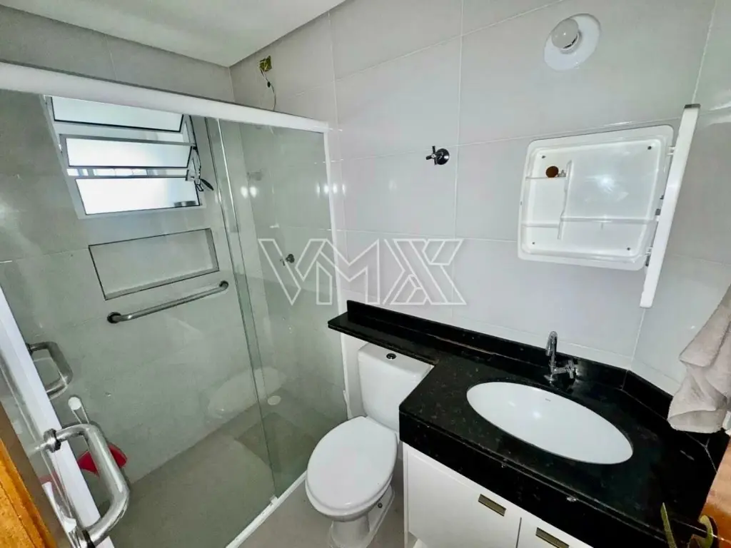 Banheiro com gabinete e box de vidro