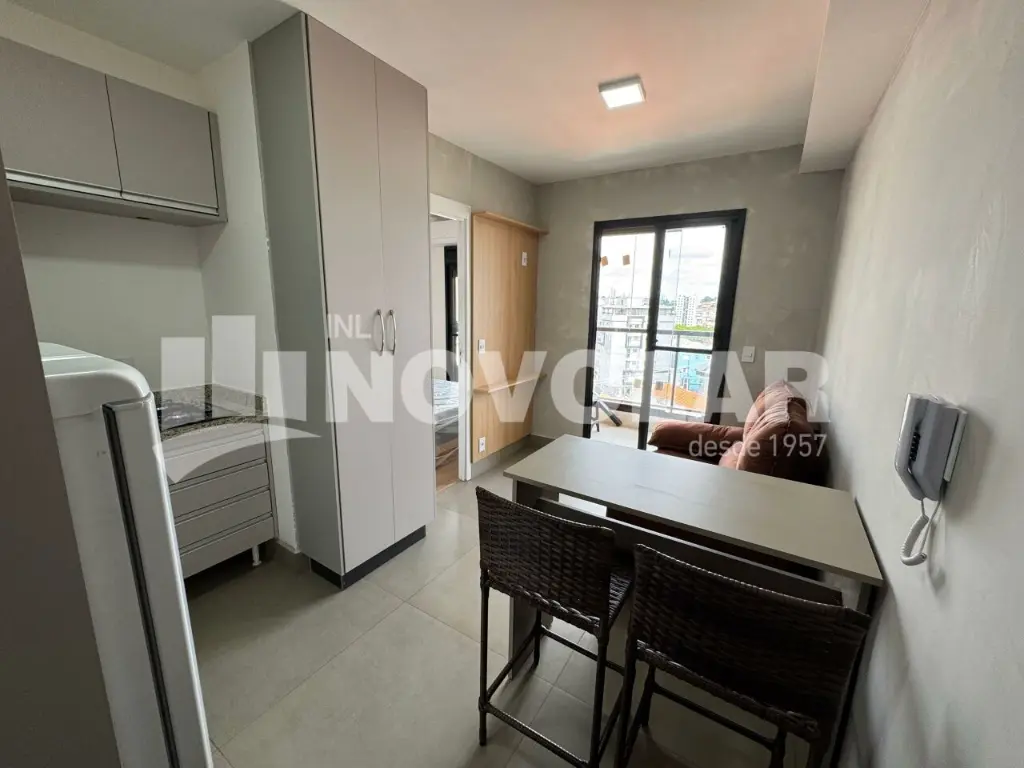 Apartamento novo, 1ª locação, com 28 m² muito bem distribuídos, ideal para uma pessoa ou, no máximo, um casal sem filhos.