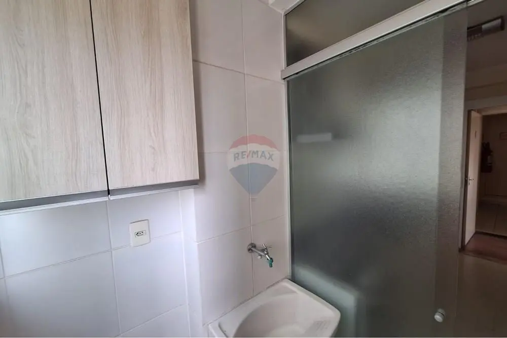 - Lavanderia com armários e porta de correr de vidro, que separa os ambientes e ajuda a manter a organização e a funcionalidade do espaço.