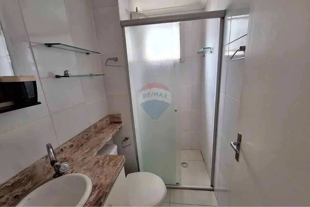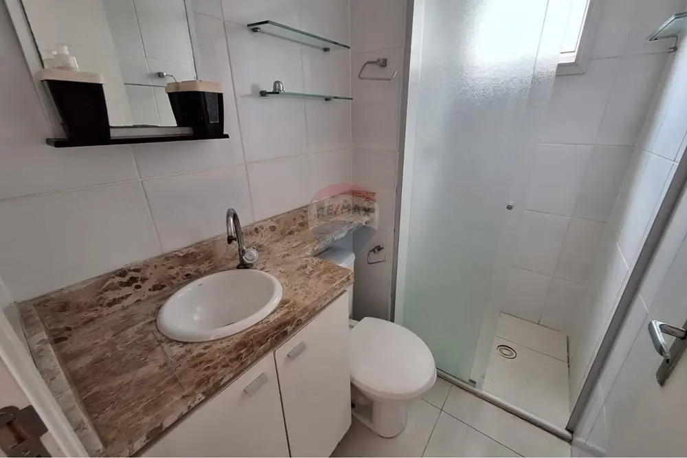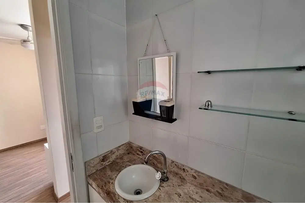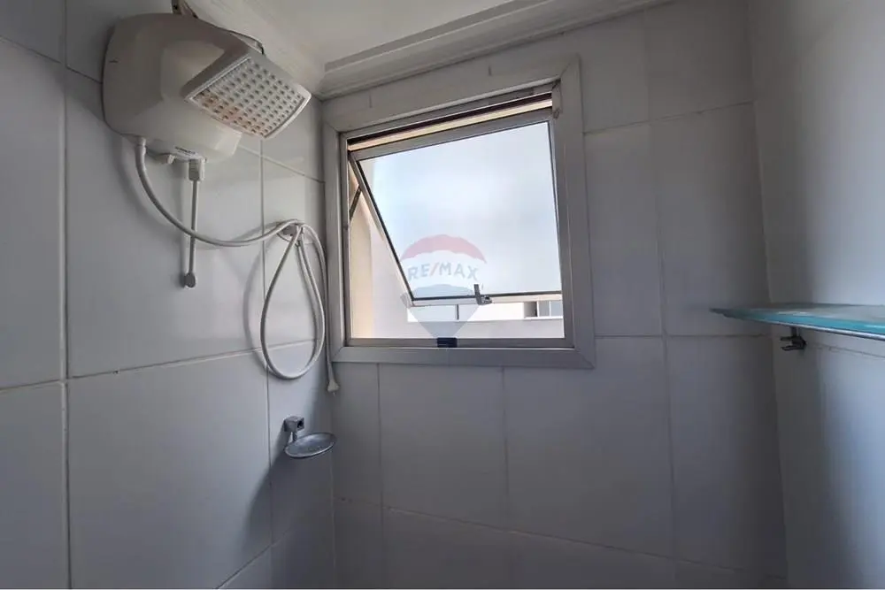 - Banheiro completo e bem iluminado, com pia com tampo de granito e gabinete, box de vidro, prateleiras de vidro, espelho e janela externa, garantindo ventilação natural.