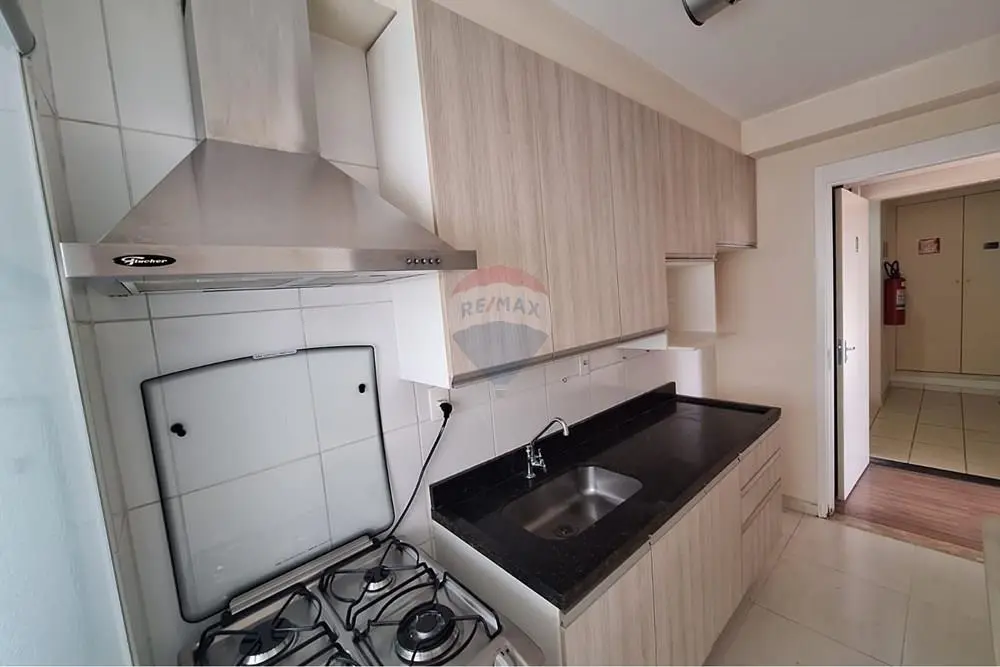 - Cozinha com armários planejados, fogão e coifa.