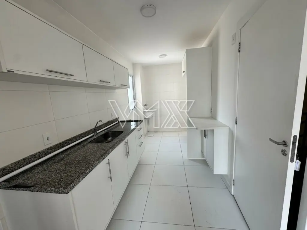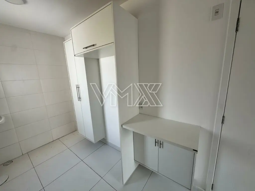 Apartamento com 2 dormitórios, sala com pequena sacada, cozinha equipada com armários, banheiro com box, área de serviço com armários planejados e 1 vaga de garagem.