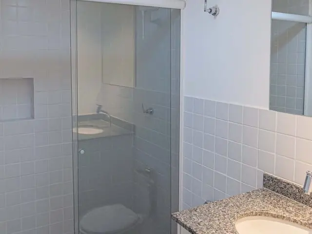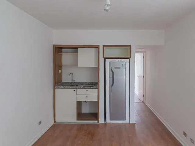 O imóvel possui piso laminado e já está equipado com armários embutidos, otimizando os espaços. A cozinha dispõe de cooktop, geladeira e micro-ondas (mediante disponibilidade), enquanto o banheiro conta com chuveiro instalado. O dormitório oferece ar-condicionado, garantindo mais conforto em todas as estações.
