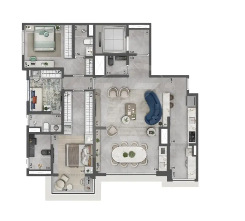 Conta com 3 dormitórios, todos suítes, além de uma planta inteligente com varanda, cozinha integrada à sala, proporcionando mais amplitude e integração aos ambientes, lavabo e lavandeira.
