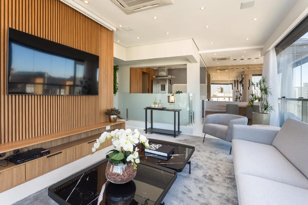 Piso superior com living, sala de jantar e cozinha integrada em um ambiente todo envidraçado com vista de 270° livre e espetacular dos Jardins. Cozinha completa com marcenaria e eletrodomésticos e bancada em Quartzo Branco.