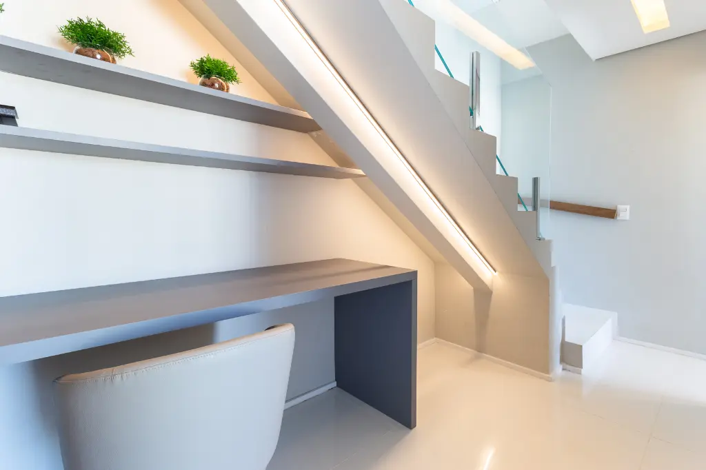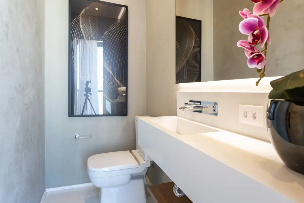 Piso inferior conta com espaço para Home Office; 2 suítes completas com marcenaria e painel ripado, em que uma delas conta com um closet walk-in.