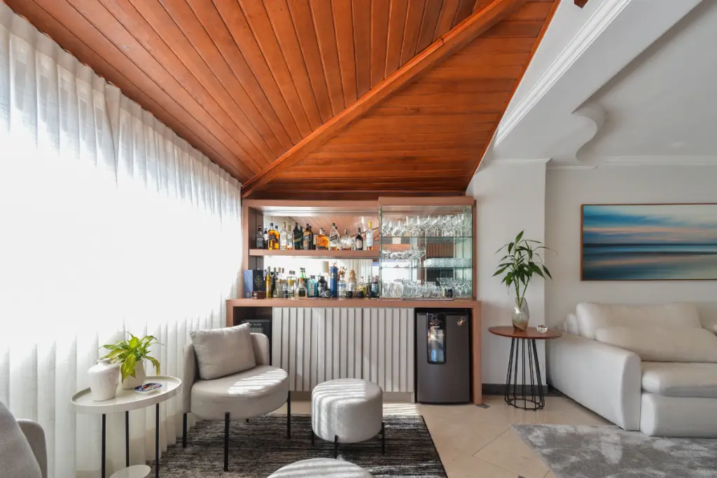 Piso superior: Relaxe em uma bela sala de estar com bar exclusivo e terraço equipado com churrasqueira, além de uma vista deslumbrante da cidade que proporciona uma excelente ventilação e iluminação.