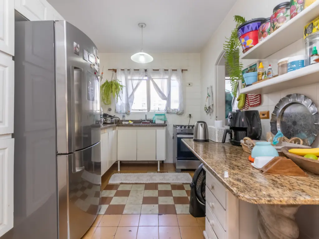 A cozinha é funcional e bem distribuída, conectada à área de serviço, que inclui um quarto de apoio com banheiro exclusivo, podendo ser transformado em despensa, escritório compacto ou espaço multiuso conforme suas necessidades.