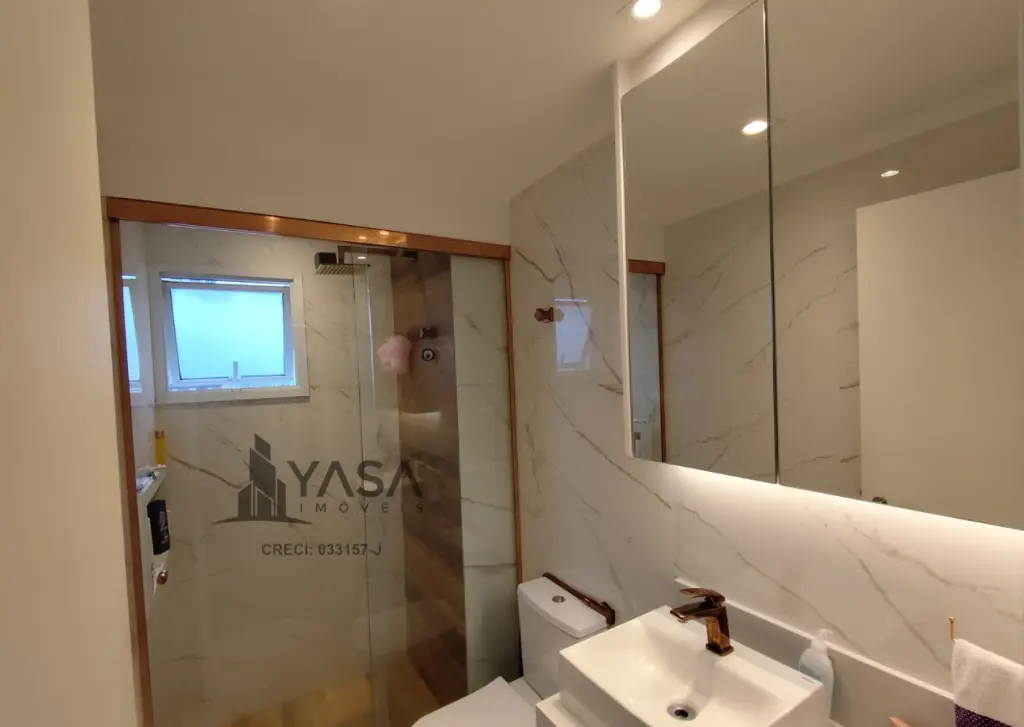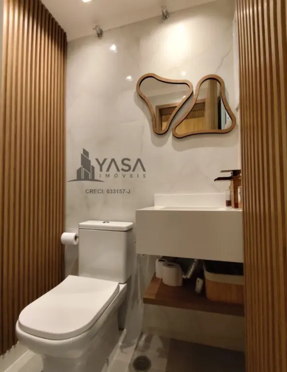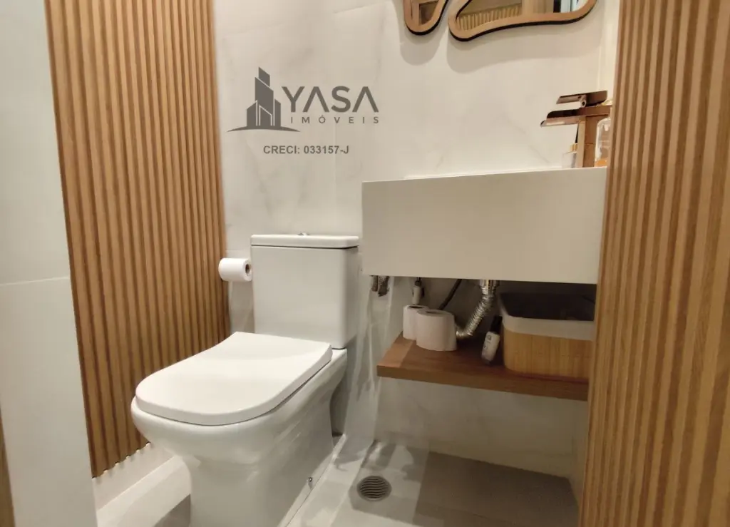 Banheiro social e lavabo com móveis planejados