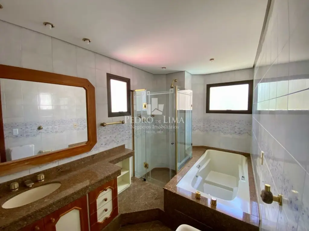 São 4 quartos sendo 3 suítes, a principal com banheira e chuveiro separados.