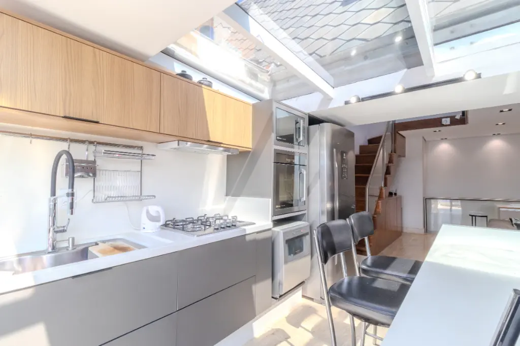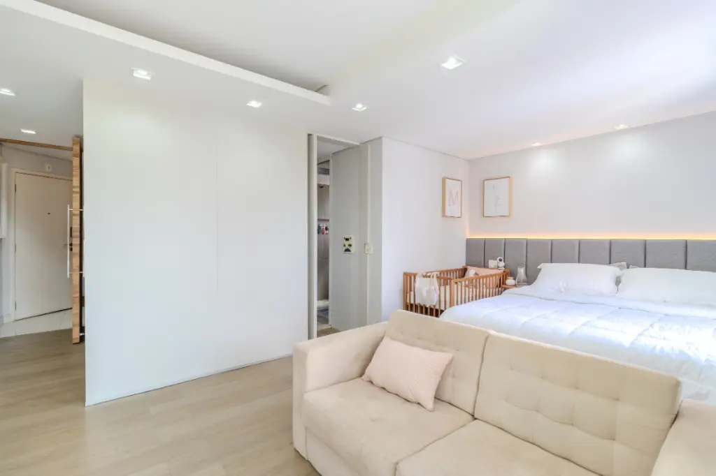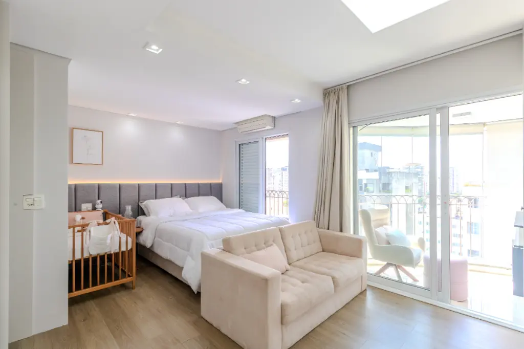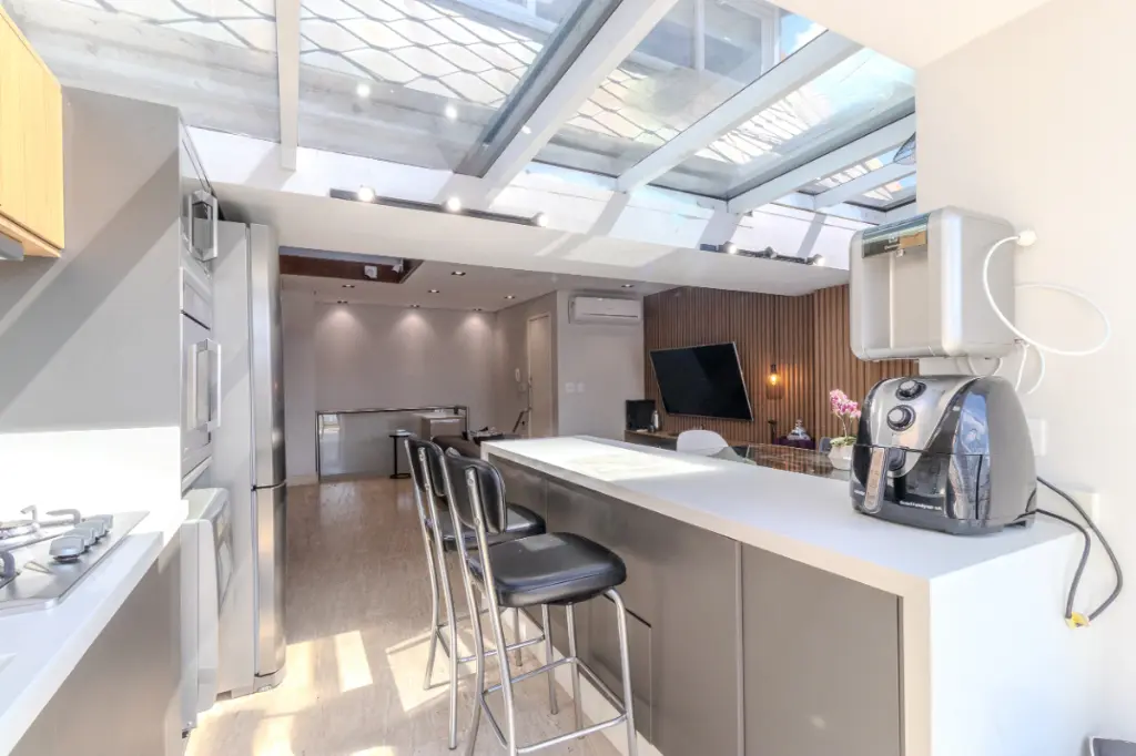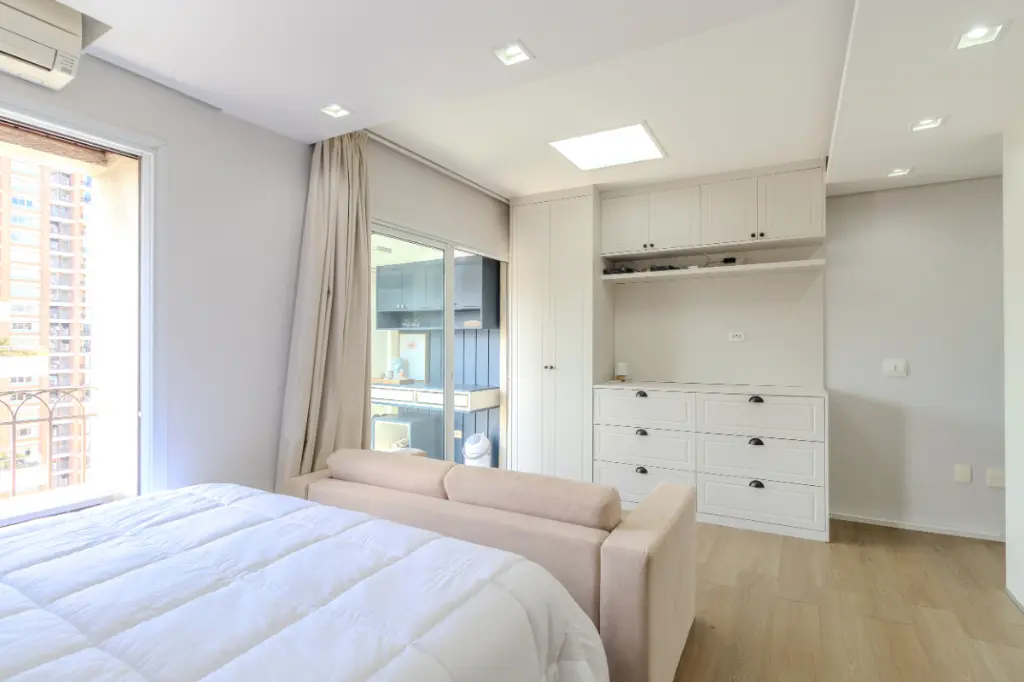 O imóvel possui 2 quartos, sendo 1 suíte ampla e bem iluminada, além de um escritório que oferece praticidade para quem trabalha em home office. Todos os quartos contam com ar-condicionado, garantindo conforto térmico em qualquer época do ano.