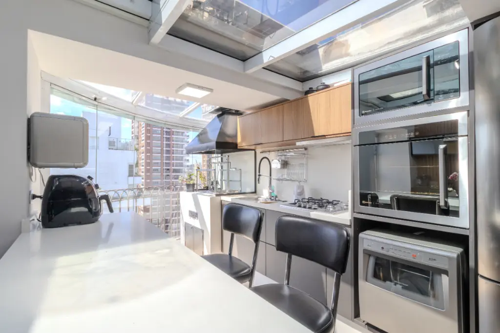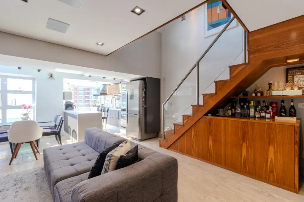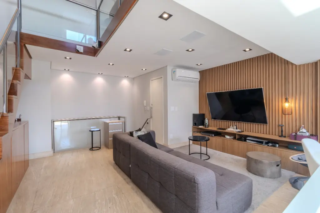 A área social é um dos grandes destaques da cobertura: uma sala aconchegante integrada à área gourmet, ideal para viver momentos de tranquilidade ou receber amigos com charme e privacidade.