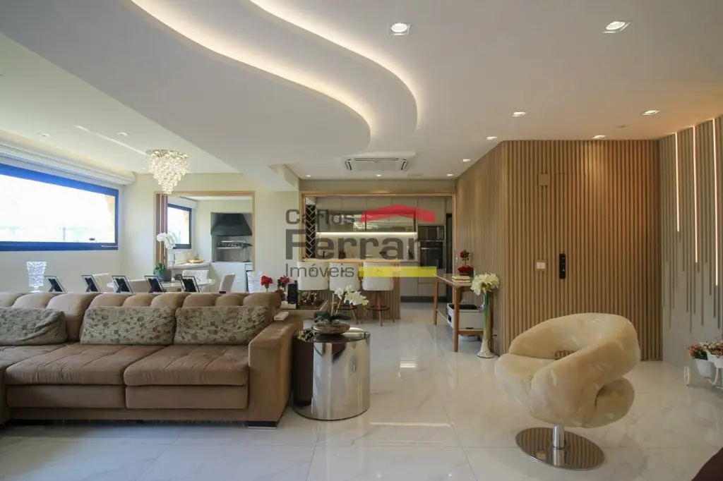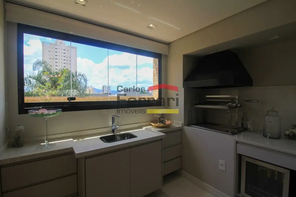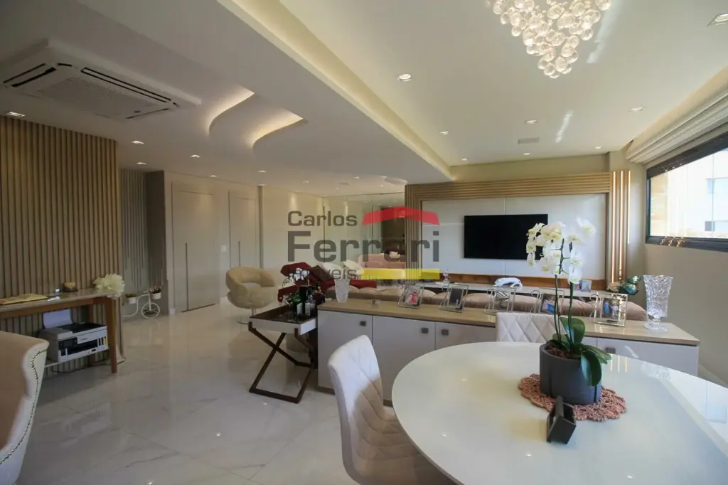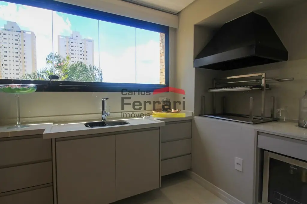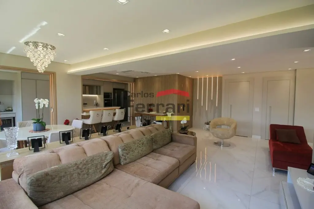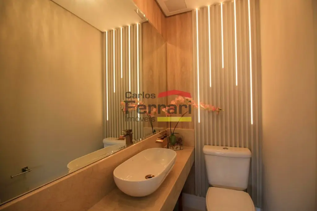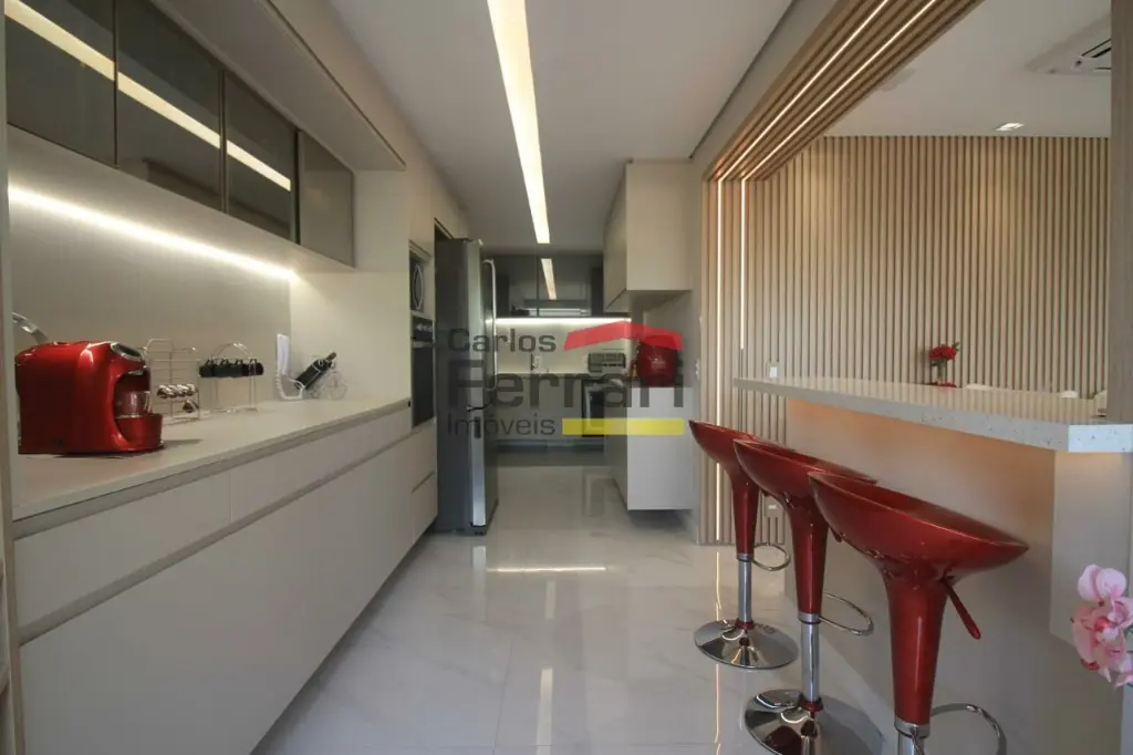 A planta conta com sala para 2 ambientes com integração ao espaço externo, sanca em gesso, projeto de iluminação e sistema de som embutido. A varanda garden oferece área gourmet e quintal com ótima incidência solar. Cozinha planejada com armários sob medida, funcional e bem distribuída. São 3 dormitórios, sendo uma suíte master com closet ampliado, além de escritório que atende ao home office. O imóvel possui lavabo, banheiros bem acabados, ar-condicionado central, área de serviço independente e rico em armários em todos os ambientes.