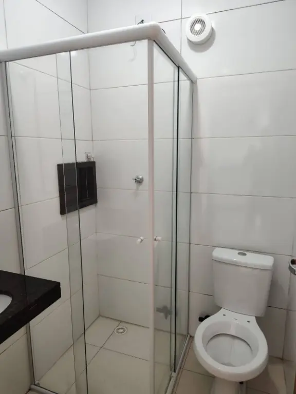 Próximo ao centro comercial com vista livre, bastante arejado, cozinha com armário e gabinete, banheiro com espelho e box de vidro, e lavanderia com tanque