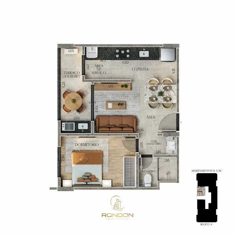 Os apartamentos foram pensados para aproveitar cada espaço com inteligência: 1 dormitório, banheiro, sala de estar integrada à sala de jantar, cozinha, área de serviço e um terraço gourmet que convida para momentos de pausa e conexão. Cada unidade conta também com vaga de garagem.
