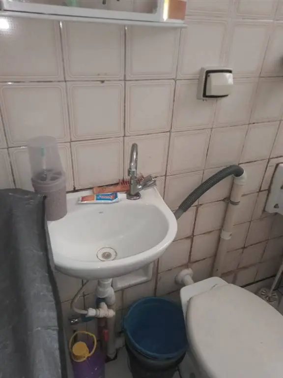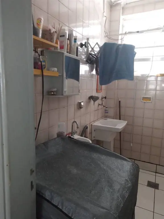 No banheiro tem lavatório e TB ei tanque no box fora a máquina de lavar.