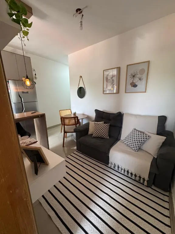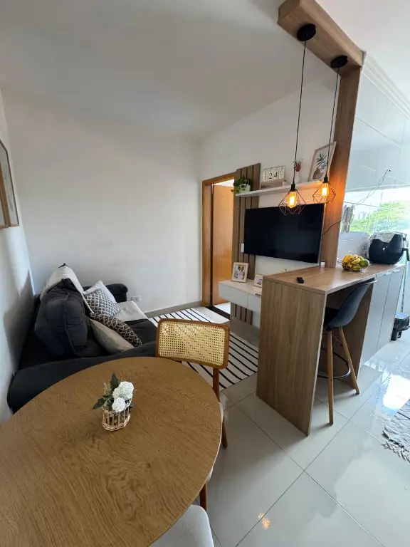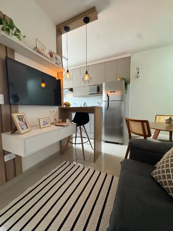 Sala integrada à cozinha americana, proporcionando amplitude e modernidade