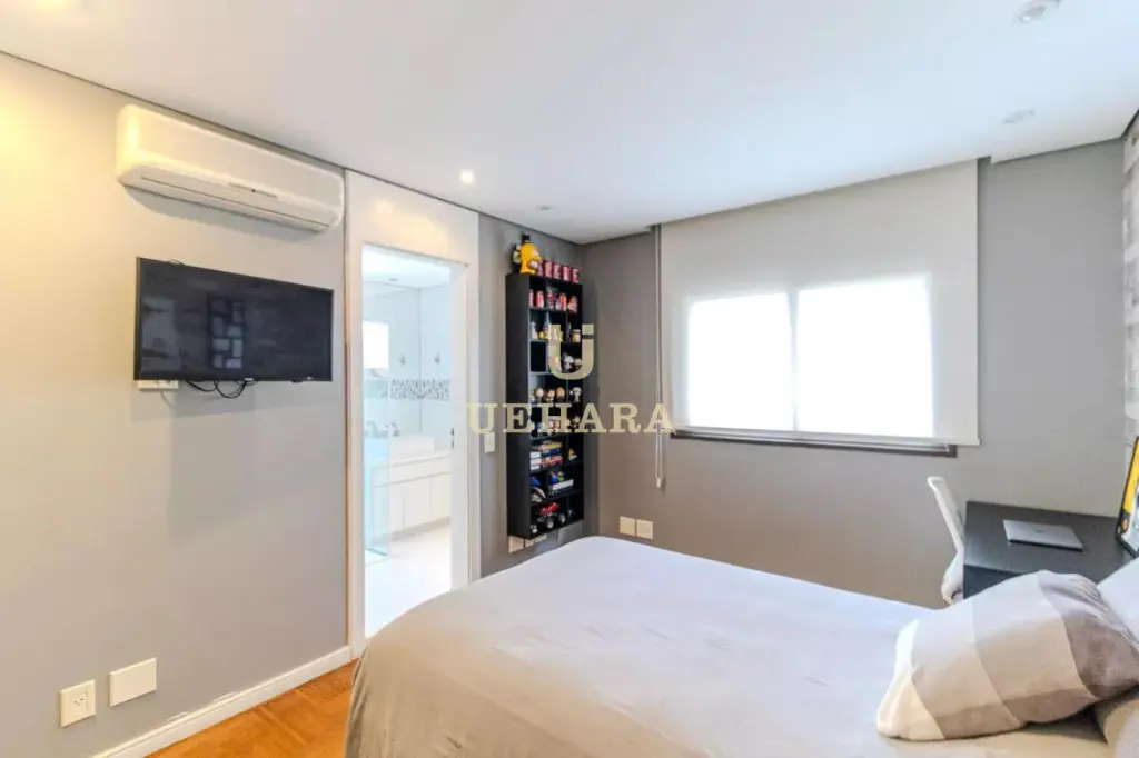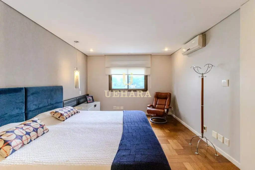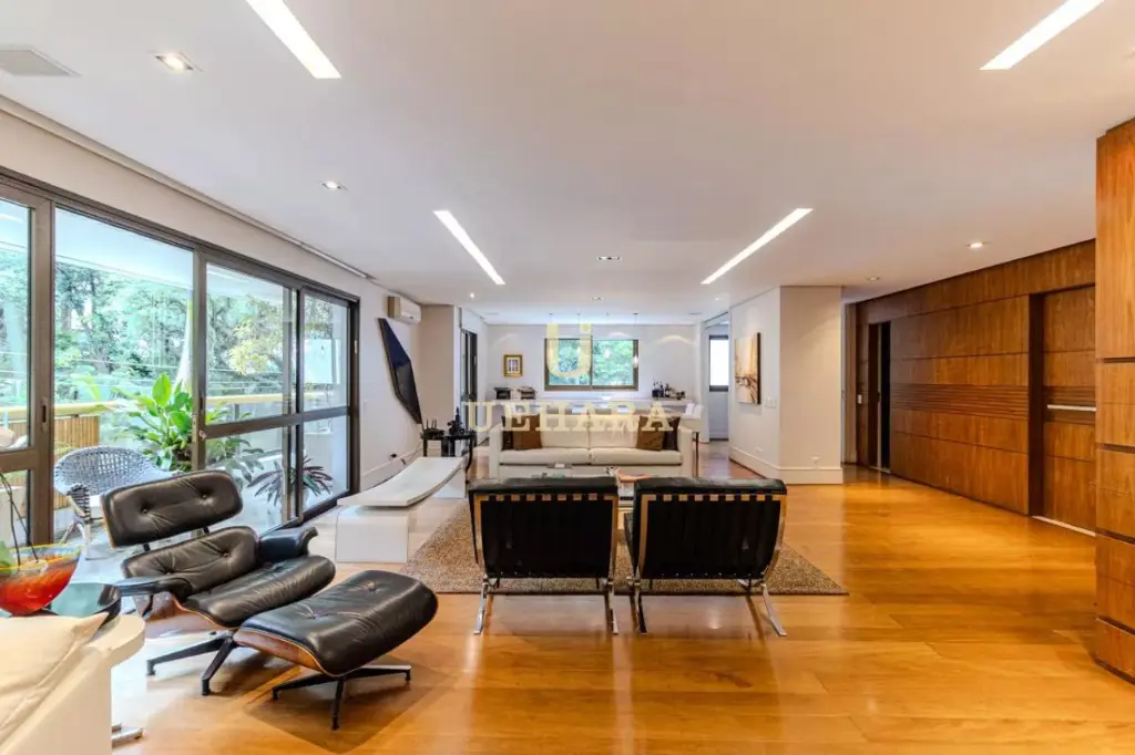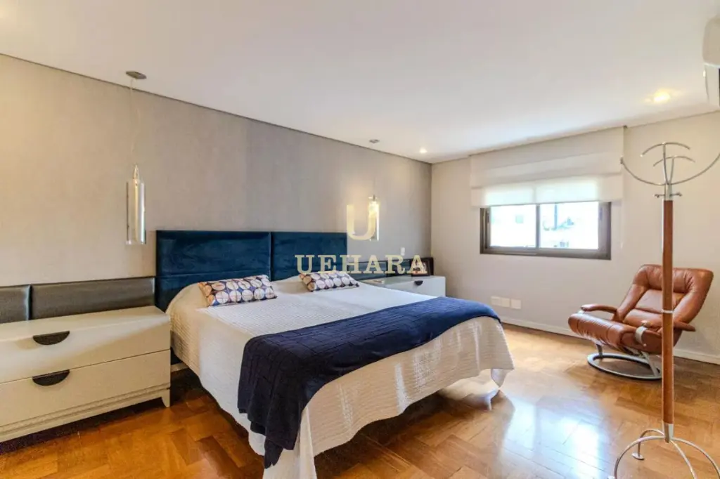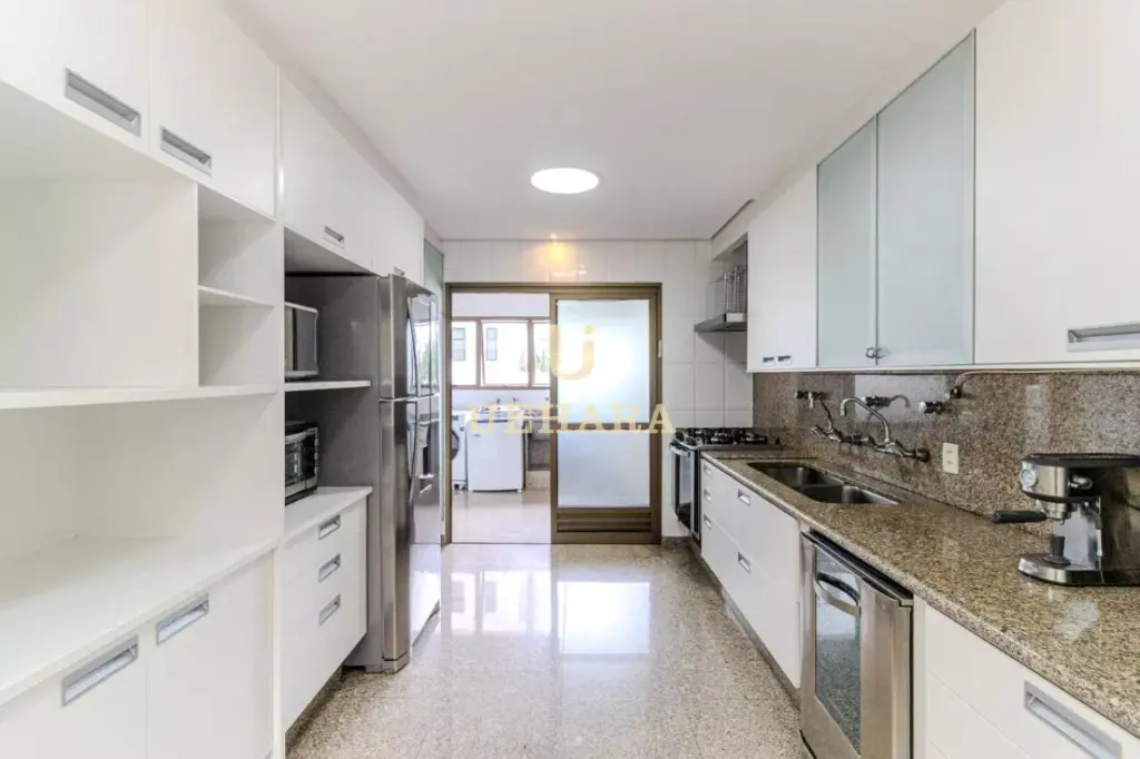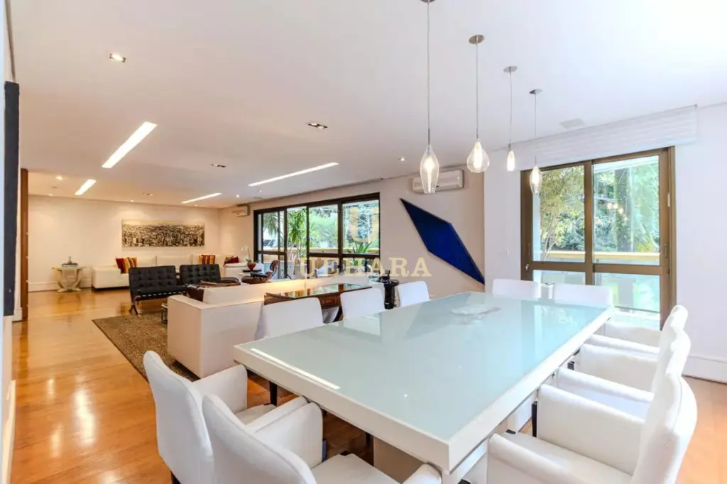 Apartamento de 303m² de muito conforto e mobiliado, com 03 dormitórios e 03 suítes, diversas salas de ambientes diferentes e aconchegantes e com varanda fechada com vidros e um jardim, cozinha e área de serviço, e 04 vagas de garagem.