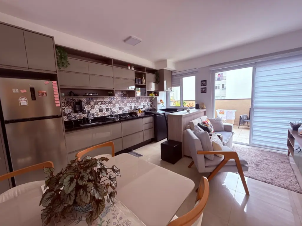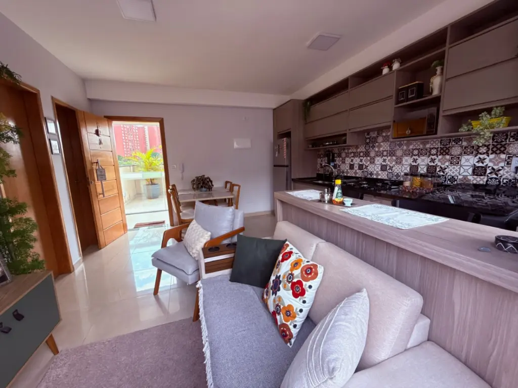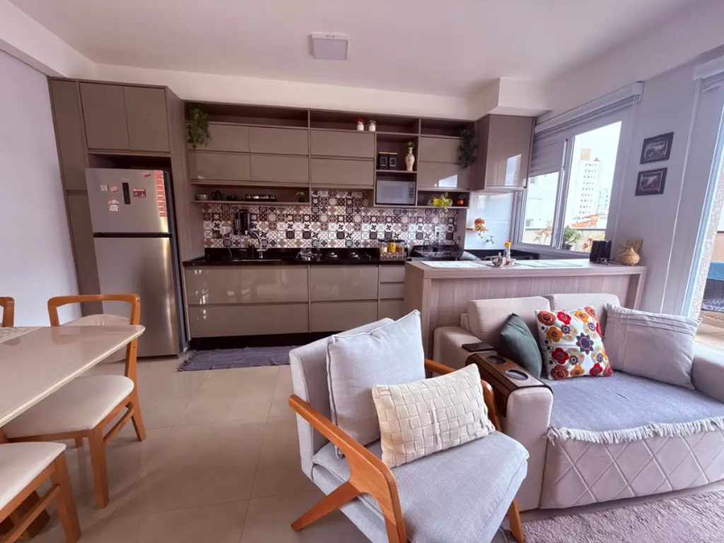 O imóvel conta com 1 dormitório bem distribuído, sala integrada à cozinha, criando um ambiente moderno e funcional, perfeito para receber amigos ou aproveitar momentos de descanso com mais amplitude. A cozinha possui móveis planejados, oferecendo ótimo aproveitamento de espaço, além de cooktop já instalado. A área de serviço é integrada à cozinha, mantendo a praticidade no dia a dia.