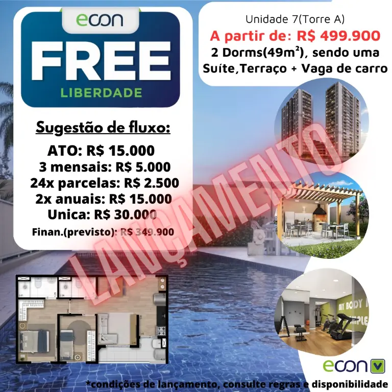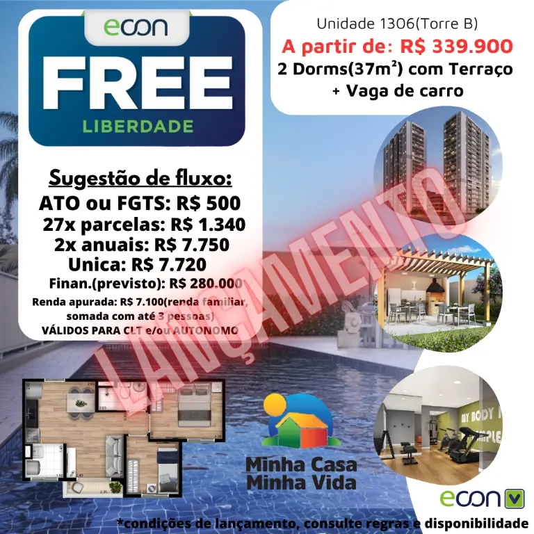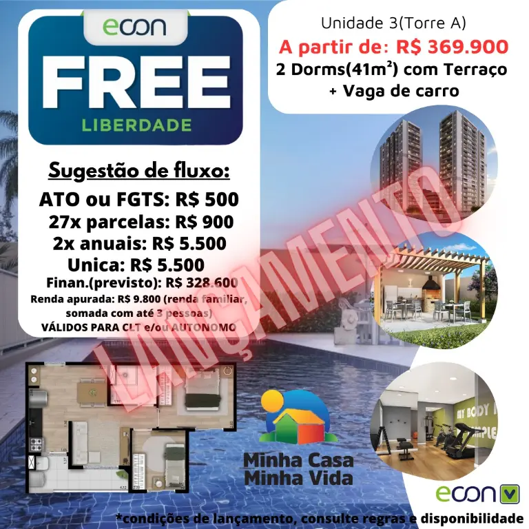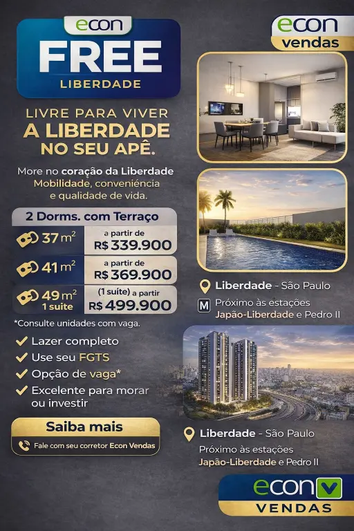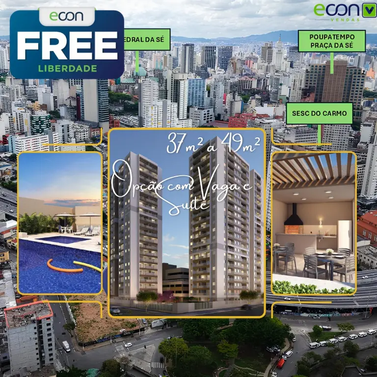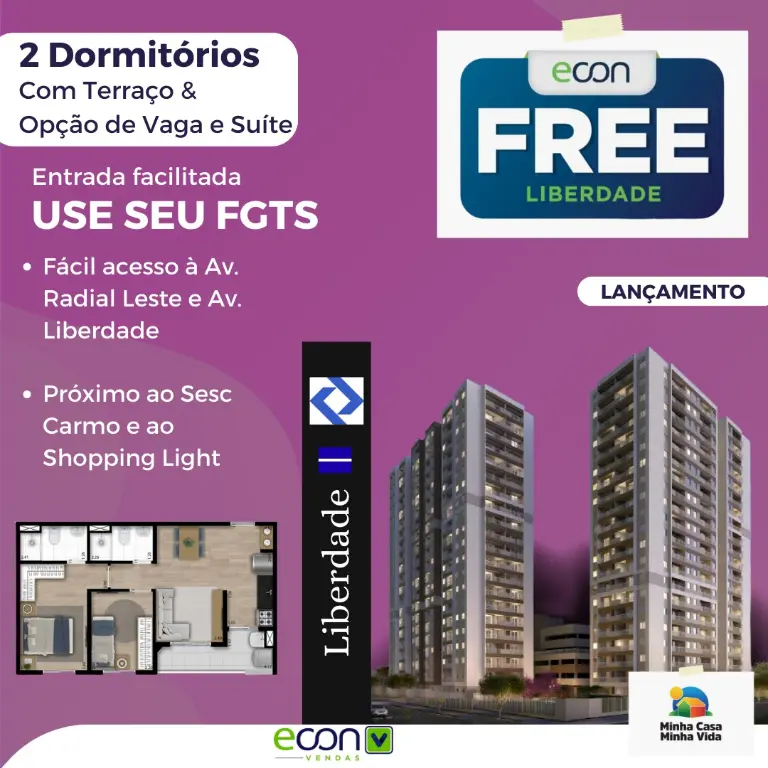 O Free Liberdade nasce com algo que o mercado inteiro procura - ?? Apartamentos com 2 dormitórios com terraço e vaga de garagem, em uma região central de São Paulo, dentro do programa Minha Casa Minha Vida, e ao mesmo tempo aberto para investidor, sem limitador de renda.