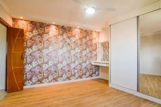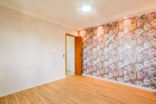 ?Quartos com papel de parede instalados e sanca com spots.
