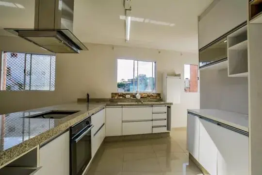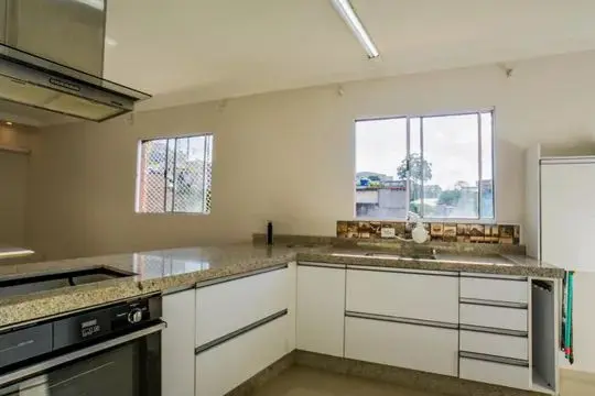? Bancada da cozinha em L grande (granito branco siena) com recorte para cooktop de 4 bocas