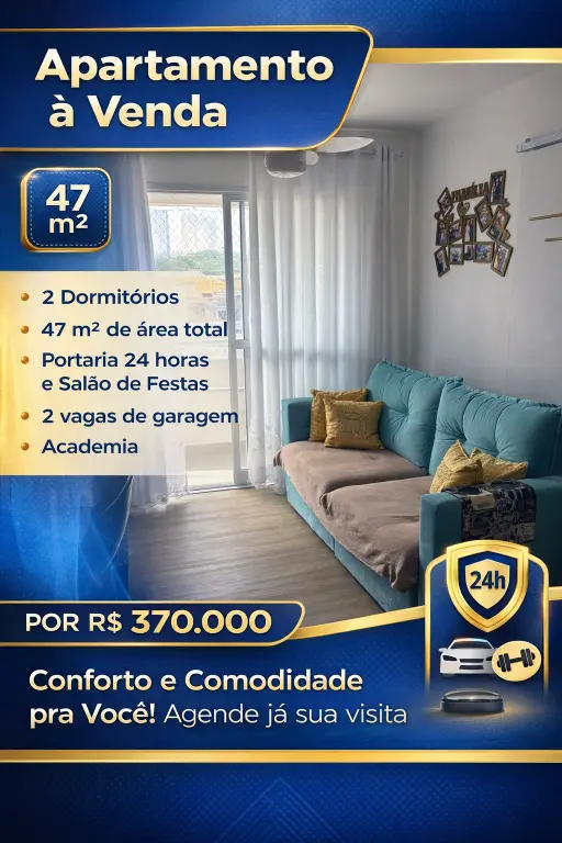 Com 47 m² de área total, este imóvel de 2 dormitórios, sendo 1 suíte, é a oportunidade perfeita para quem busca conforto e comodidade. O prédio conta com portaria 24 horas e amplo salão de festas, além de 2 vagas de garagem e uma academia, proporcionando todo o conforto que você procura. Não perca a chance de conhecer pessoalmente este excelente apartamento à venda por R$ 370.000.