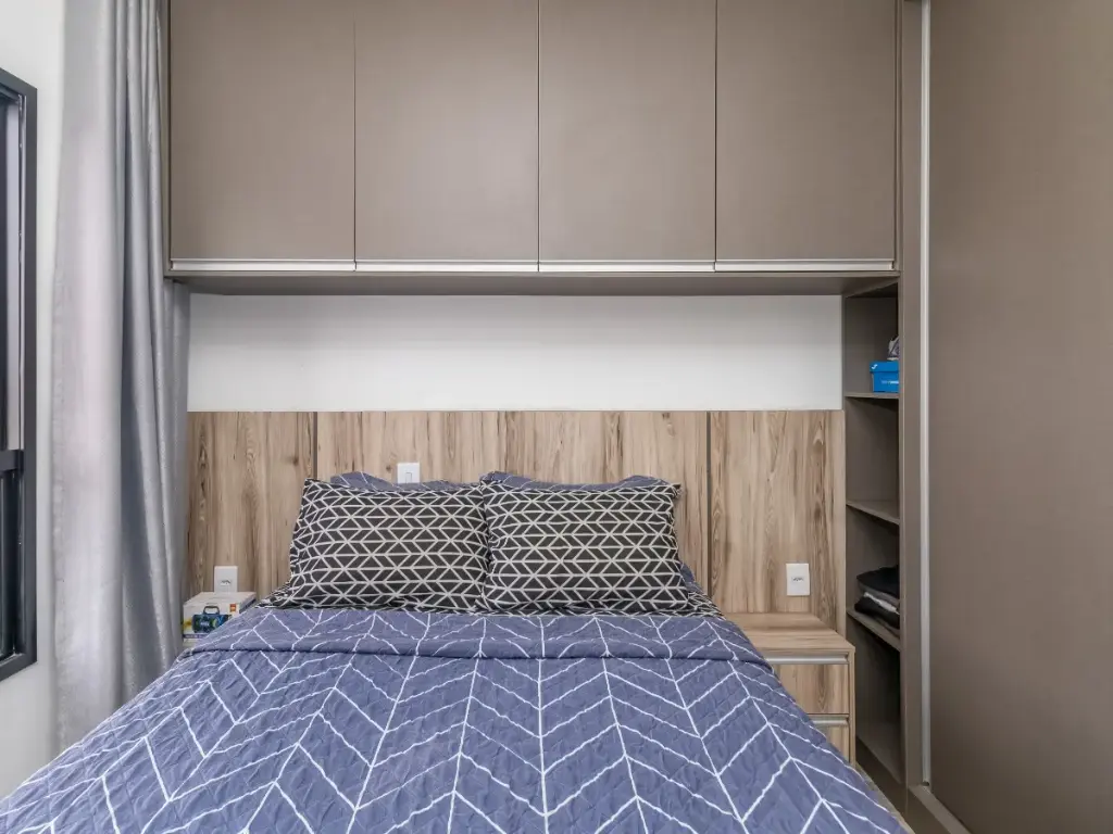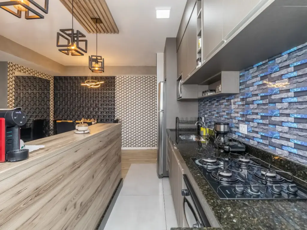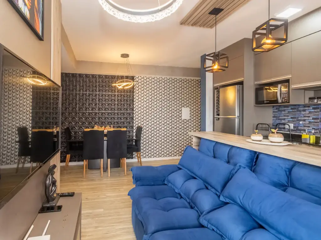 A área social foi pensada para aproveitar bem cada metro, com cozinha integrada, sala acolhedora e uma pequena varanda que traz ventilação, luminosidade e mais leveza ao ambiente. Os acabamentos reforçam essa proposta contemporânea, com móveis planejados, piso laminado e piso vinílico, compondo um imóvel que transmite cuidado e aproveitamento inteligente dos espaços.