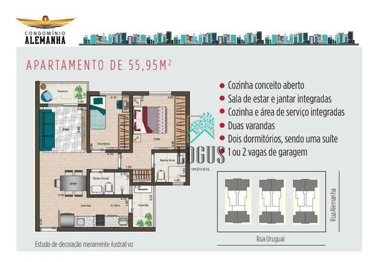 Apartamento novo com 56m², distribuídos em 2 dormitórios, sendo 1 suíte, 2 banheiros, 2 varandas e 1 vaga de garagem.