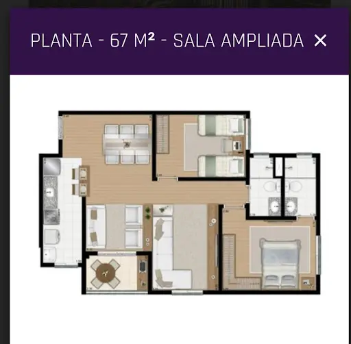 Composto por 2 quartos sendo um suíte, wc Social, sala 3 ambientes com sacada envidraçada, cozinha espaçosa e lavanderia.