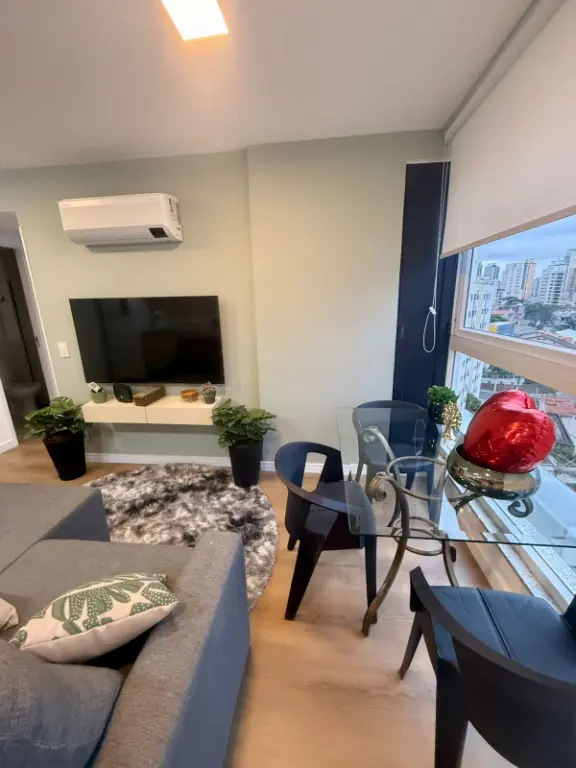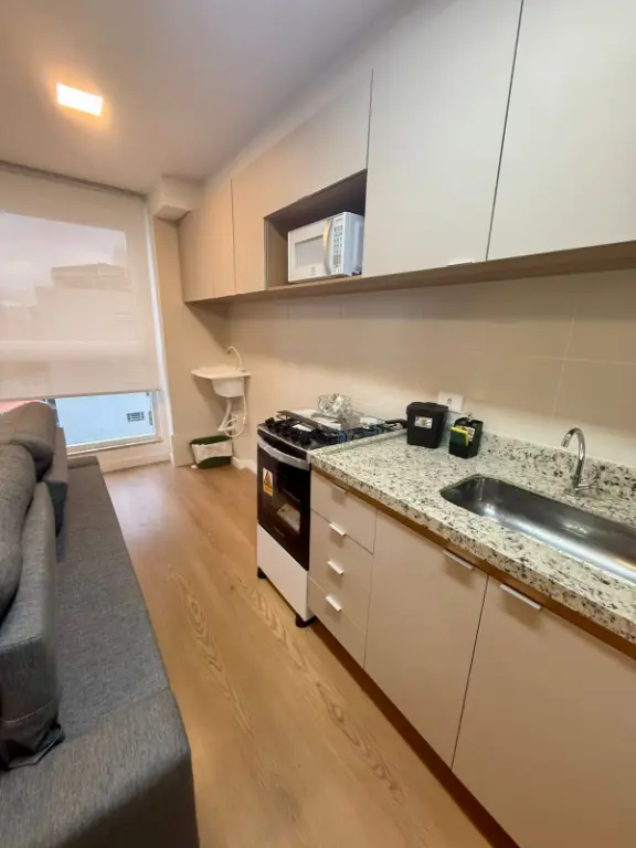 Lindo apto, com ar condicionado, geladeira, fogão, microondas, filtro electrolux, tv 55 polegadas, sofa, tapete, mesa com 3 cadeiras,