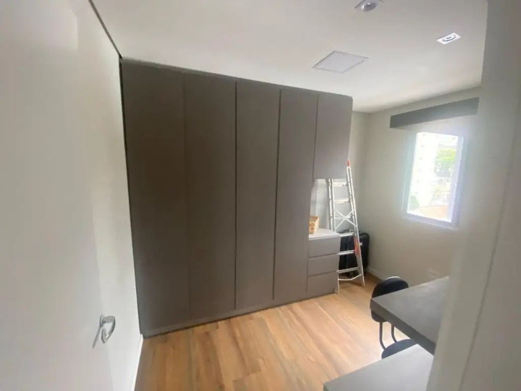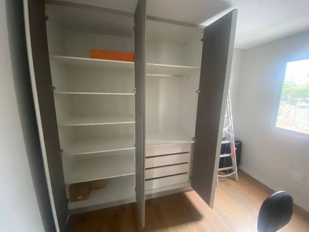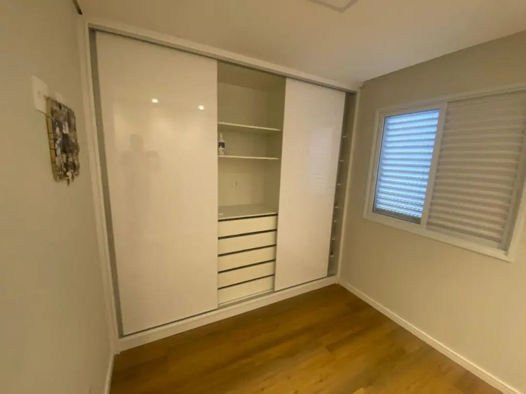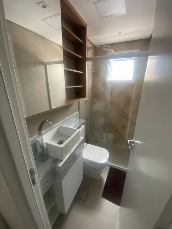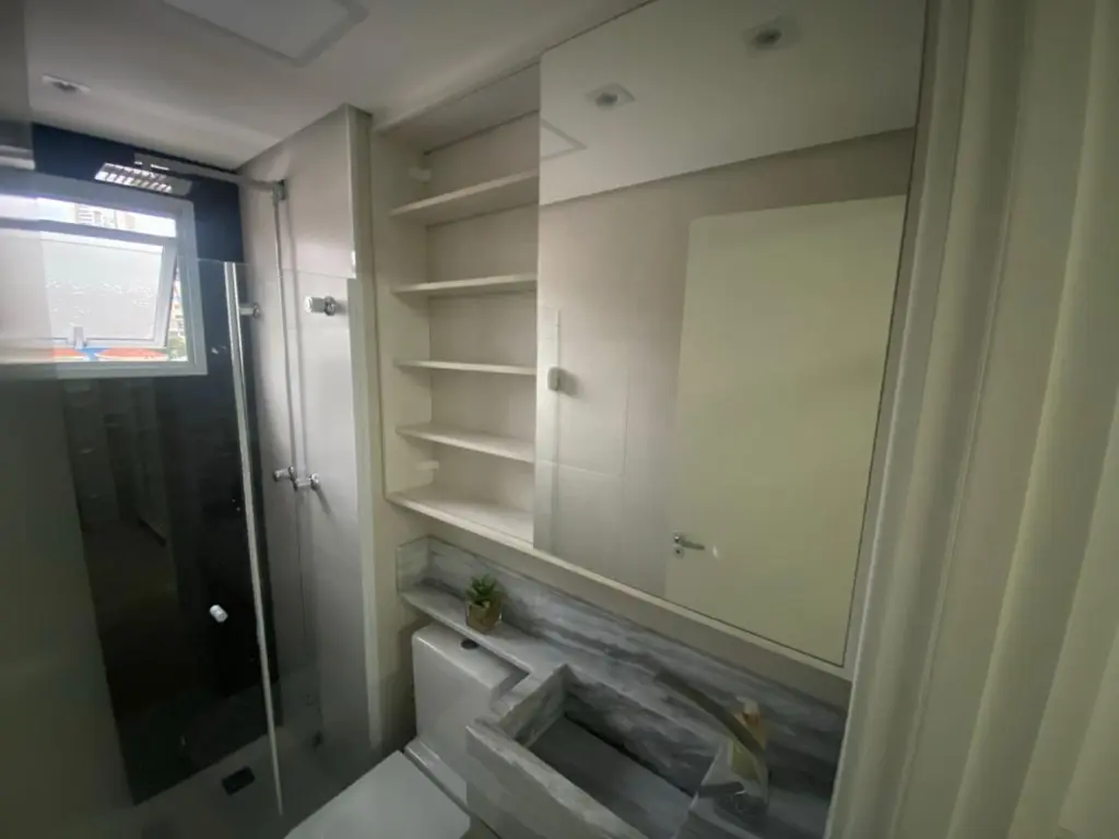 Apartamento frente, do 2° ao 4° andar, com box, chuveiro, gabinete e espelho nos 2 banheiros, cozinha planejada com balcão, área de serviço com fechamento em vidro, aquecedor e armário, sala com rack, terraço com fechamento em vidro, dormitórios com armários, 1 vaga,