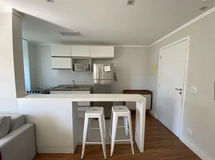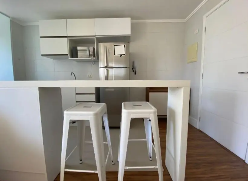 Cozinha: Geladeira, foga~o, bancada, arma´rios e duas banquetas.