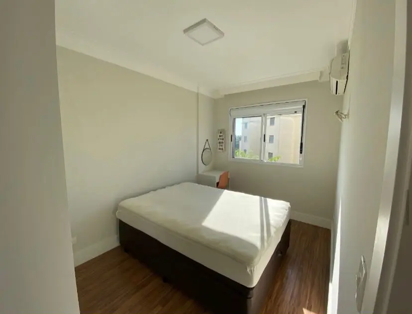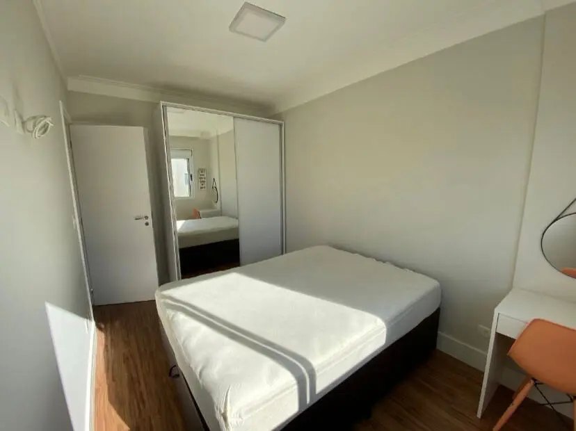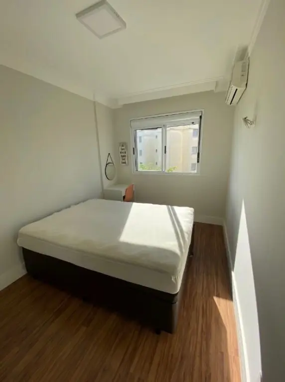 Sui´te: Cama, guarda roupa, mesa, cadeira, quadro, ar condicionado, banheiro com espelho e mo´vel embaixo da pia.