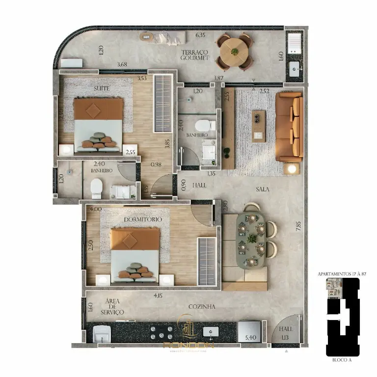Os apartamentos oferecem 2 dormitórios, sendo 1 suíte, além de banheiro social, sala de estar integrada à sala de jantar, cozinha, área de serviço e um terraço gourmet que amplia seus momentos de convivência. Cada unidade conta ainda com vaga de garagem, trazendo praticidade ao dia a dia.