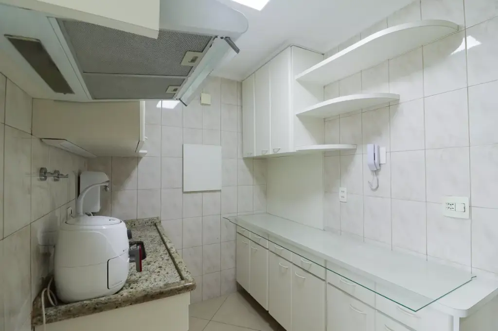 Cozinha com armários, fogão e geladeira