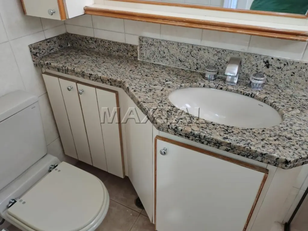 Os banheiros contam com box, gabinetes e acabamento moderno.